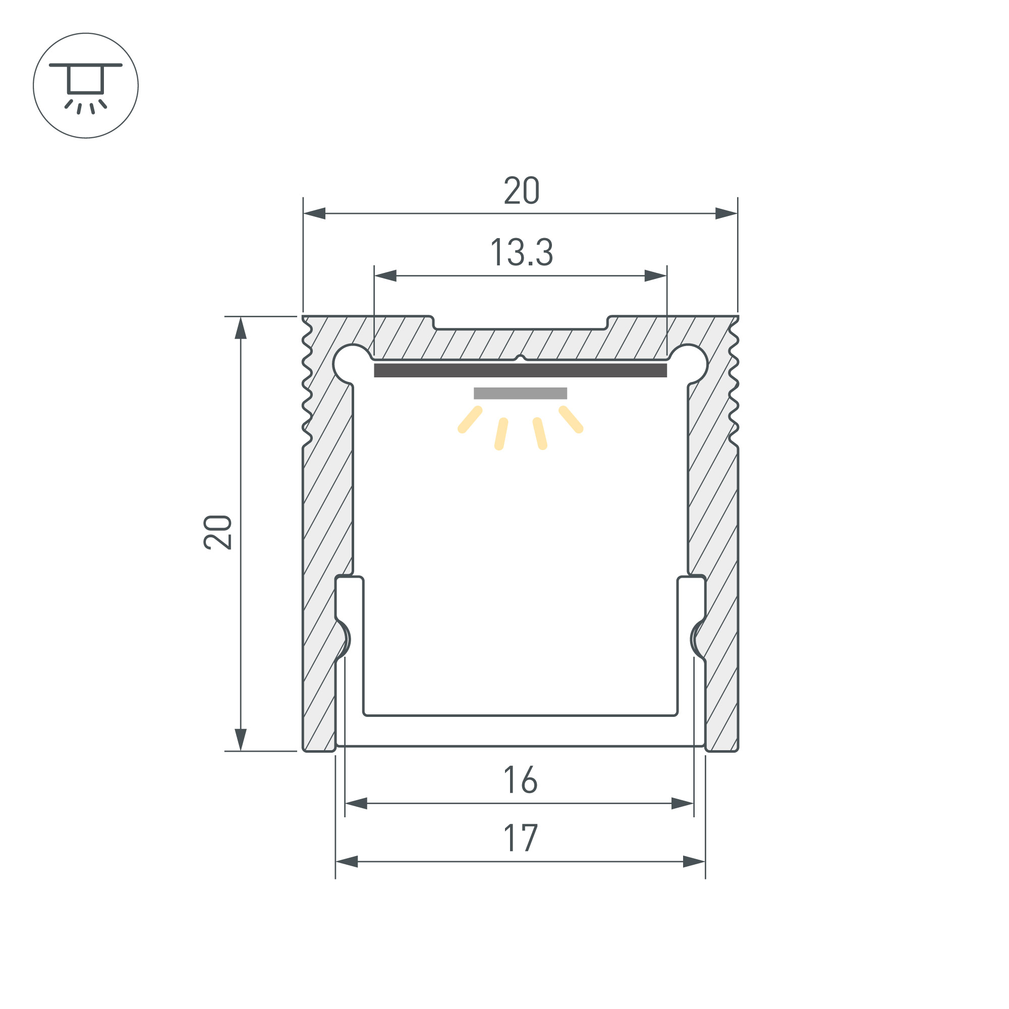 Алюминиевый анодированный профиль для светодиодных лент и линеек. Габаритные размеры (L×W×H): 2000x20x20 мм. Ширина площадки для ленты 13,3 мм. Экраны, заглушки и другие аксессуары приобретаются отдельно. Цена за 1 метр.