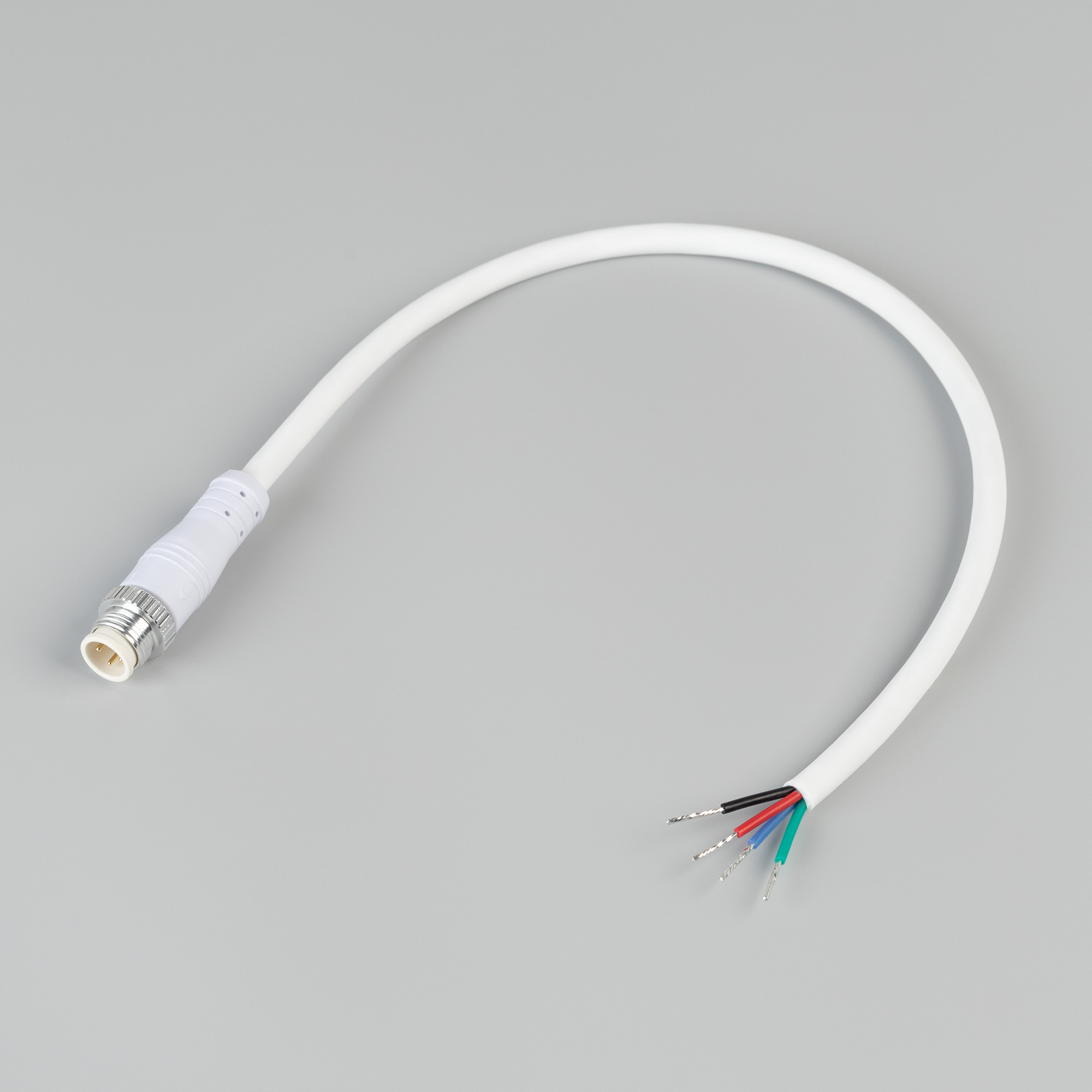 Герметичный Male (папа) коннектор питания на проводе для RGB герметичной ленты серии WAVE-DOUBLE 1615, обеспечивает простое и надежное подключение с уровнем пылевлагозащиты IP67. Провод имеет белую оболочку, коннектор сделан из белого пластика, и имеет габариты 250x15x15 мм.