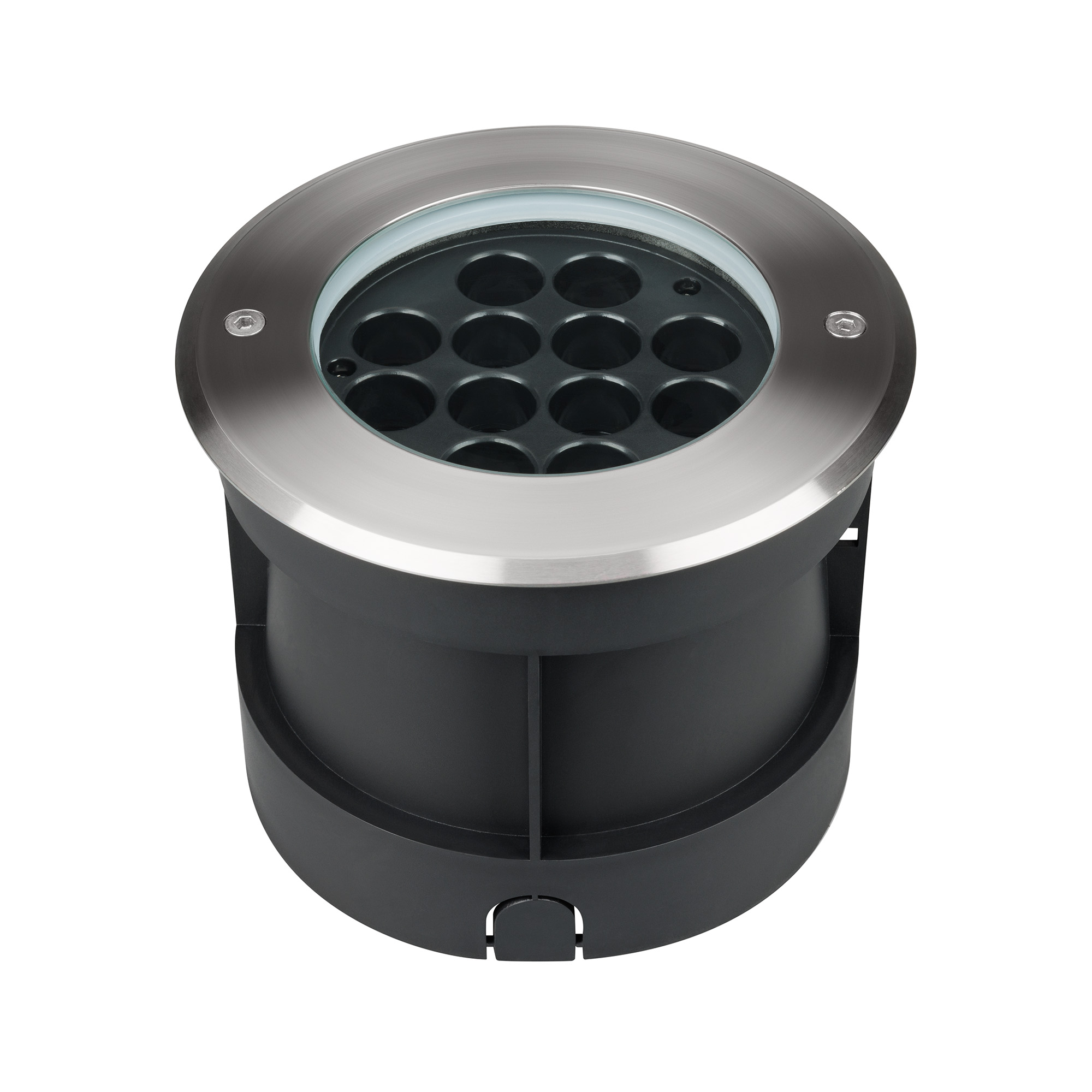 Встраиваемый светодиодный светильник для грунта и пола. Мощность 25 Вт, световой поток 2217 лм, цвет дневной 4000К. CRI(Ra)>80, угол 20°. Круглый влагозащищенный корпус IP67, нержавеющая сталь. Экран закалённое стекло. Питание 230В, 25Вт. Размер DxH Ø180x140мм. Установка в отверстие DxH Ø166x137мм.