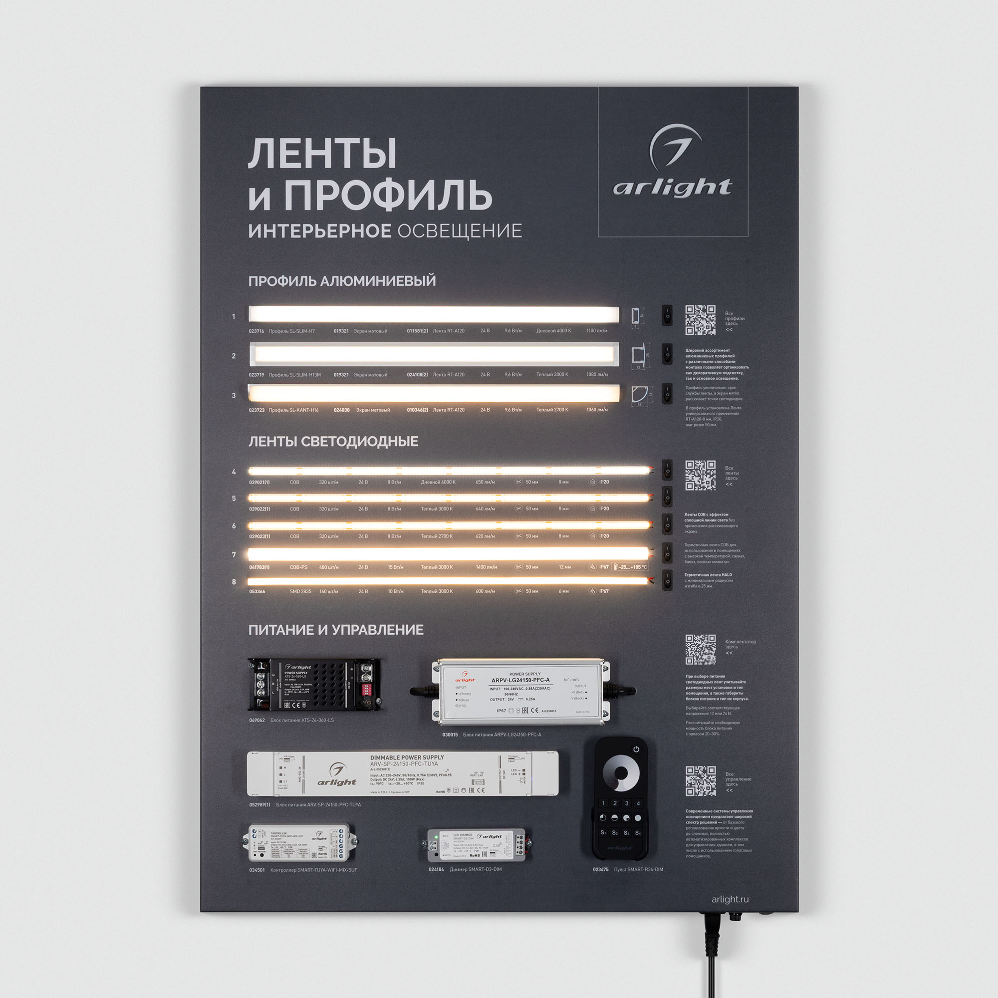 Обзорный мини-стенд по ассортименту светодиодных лент и их применению совместно с накладным профилем для декоративного и основного освещения.