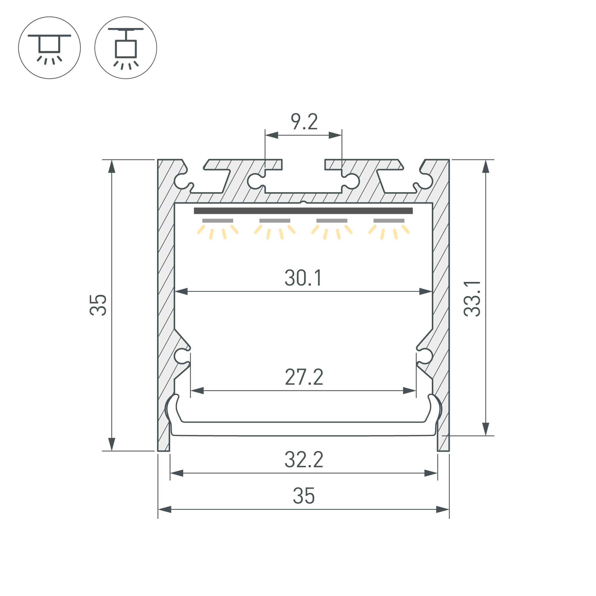 Габаритные размеры профиля составляют 2000 мм в длину, 35 мм в ширину и 35 мм в высоту. Площадки для установки светодиодных лент позволяют использовать ленты шириной до 30,1 мм и мощностью до 36,7 Вт/м. Это обеспечивает гибкость в выборе светодиодных лент и создает потрясающие световые решения.