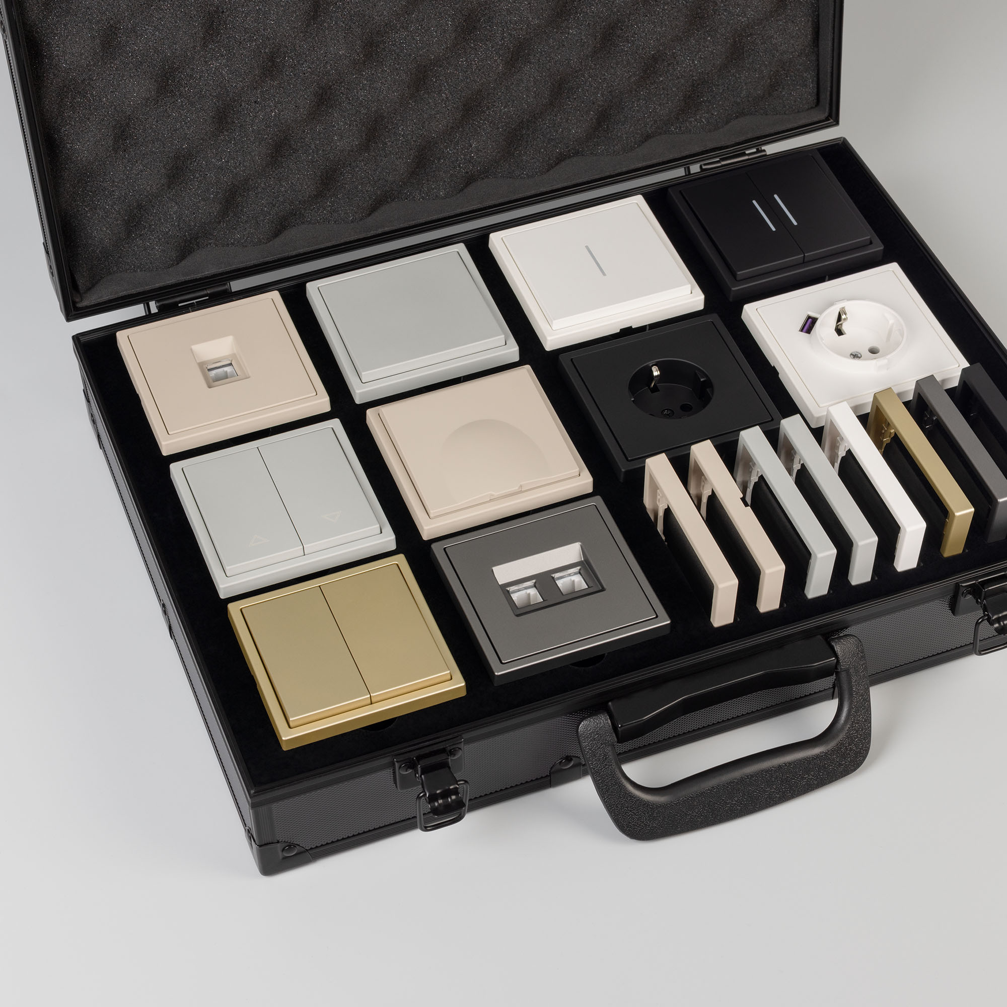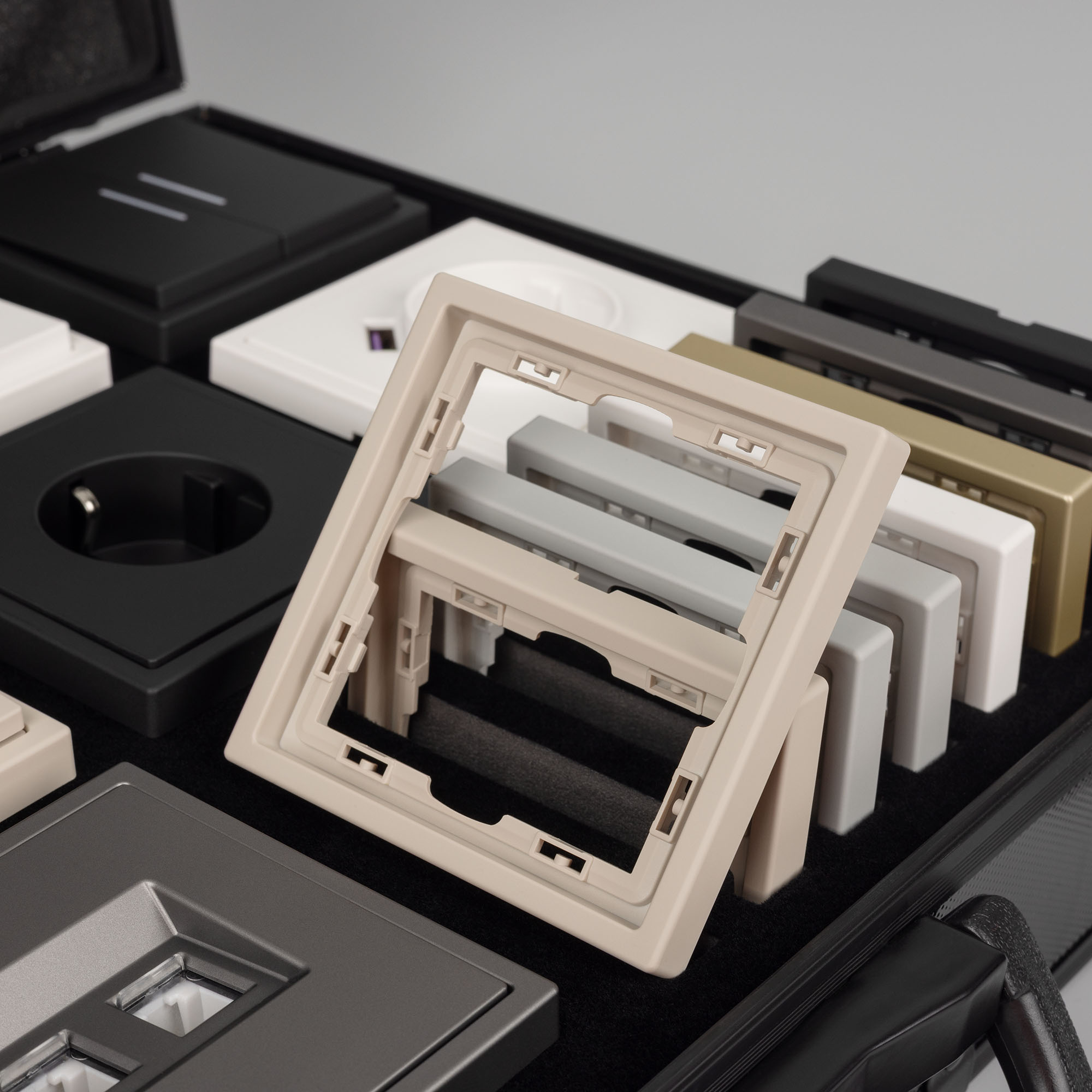 Демо-кейс с серией NOBE. Демо-кейс содержит: Рамки серии NOBE в цветах Белый кварц, Черный оникс, Золотой песок и Серый базальт. Поверхность рамок имеет Soft-Touch покрытие: арт.054212 - 3шт арт.054213 - 3шт арт.054214 - 3шт арт.054211 - 3шт арт.059454 - 3шт арт.059455 - 3шт Механизм сдвоенной розетки под выходы RJ45 для интернет кабеля в цвете Серый базальт - арт.054315 Механизм розетки с дополнительными USB Type A + Type С выходами в цвете Белый кварц - арт.054284 Механизм выключателя на две клавиши (непроходной) в цвете Золотой песок - арт.054253. Механизм выключателя на две клавиши с подсветкой LED (непроходной) в цвете Черный оникс - арт.054264. Механизм розетки под евровилку в цвете Черный оникс - арт.054277 Механизм розетки влагозащищенный в цвете Золотой песок - арт.054282 Механизм выключателя на одну клавишу с подсветкой LED (непроходной) в цвете Белый кварц - арт.054232 Механизм выключателя управления шторами на две перекидные клавиши в цвете Серый базальт - арт.054275 Рамки представленной серии накладного типа монтажа - не требуют дополнительного оборудования для установки рамки на механизме.
