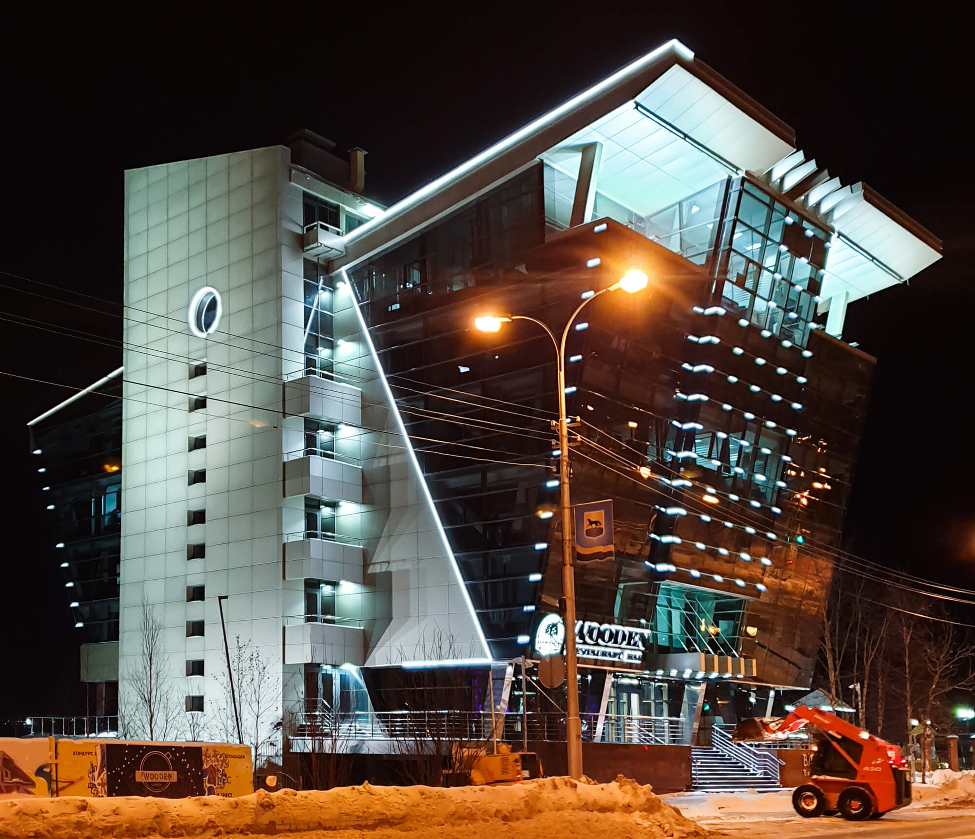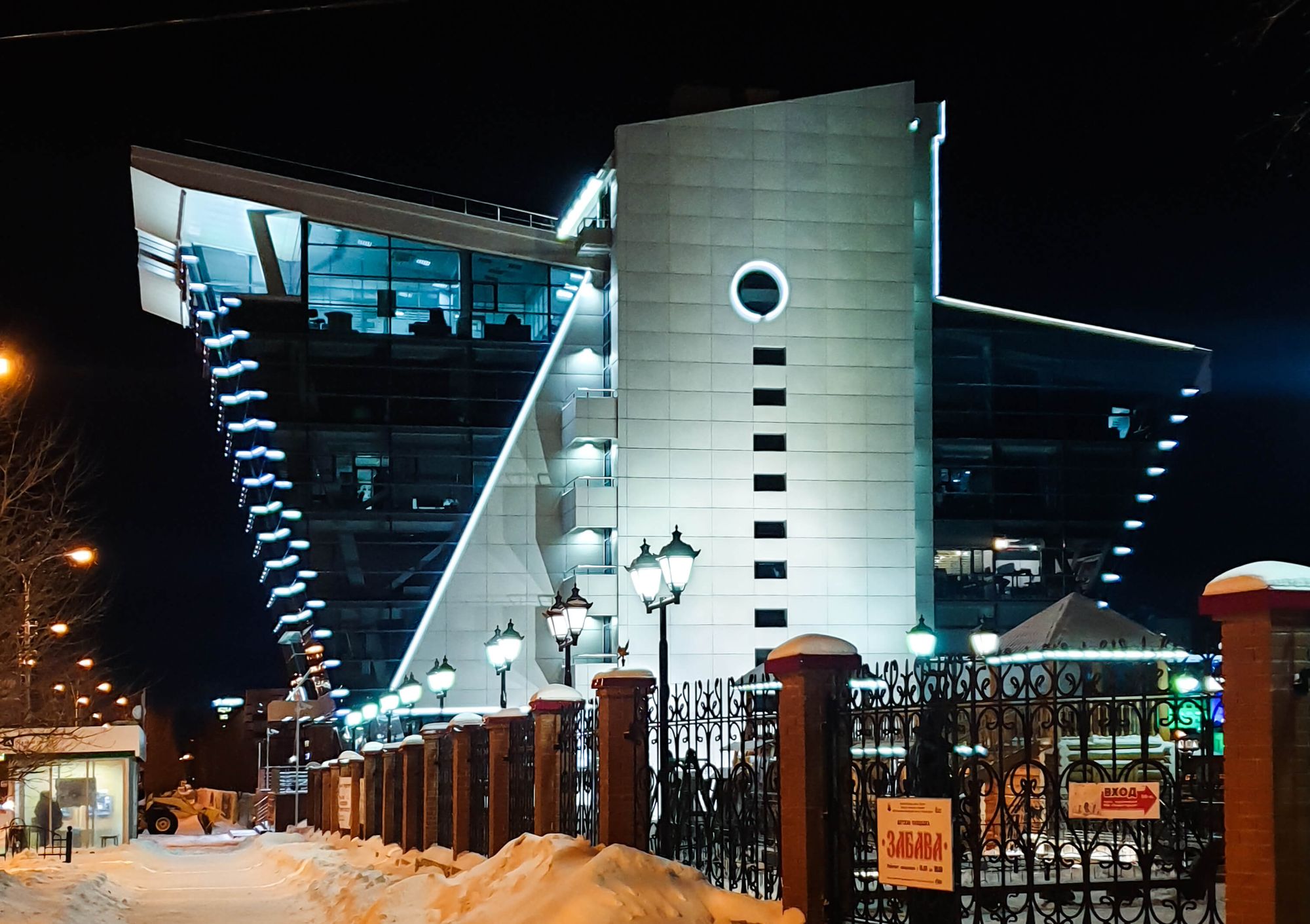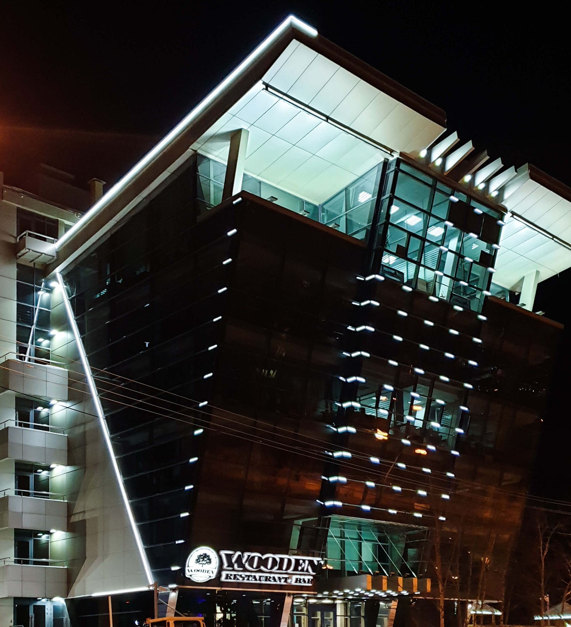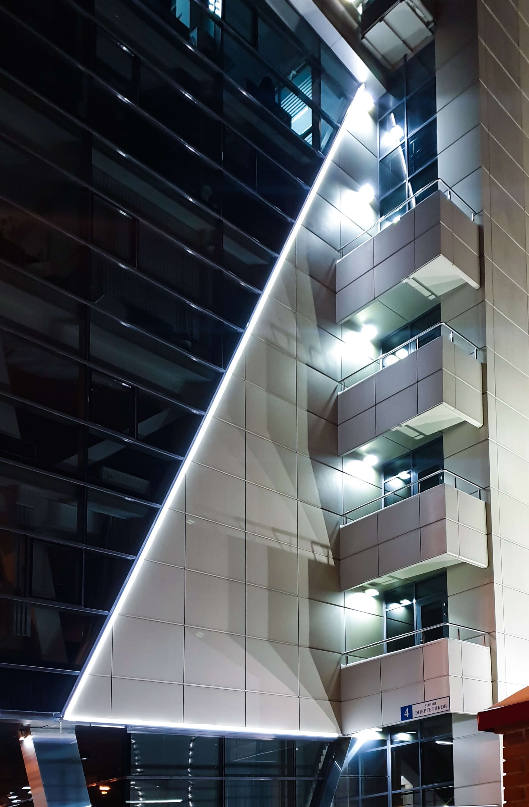 Оригинальный архитектурный облик в сочетании с блестящим стеклом, холодным металлом, серым бетоном и яркими световыми линиями. Чтобы сделать подсветку здания бизнес-центра, было использовано 250 метров герметичного гибкого неона белого цвета свечения.