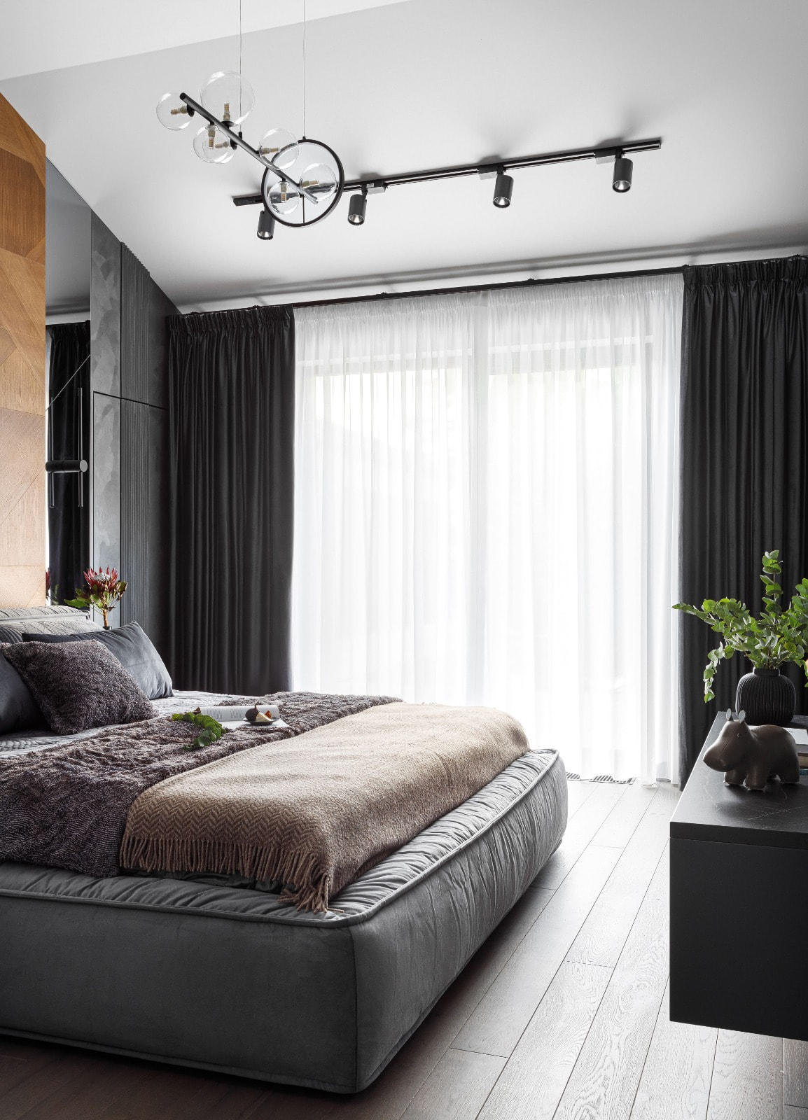 В гостевой спальне также были применены интересные решения на основе профиля. Встроенная линия света, спускающаяся с потолка на стену, не только создает дополнительное освещение, но и завершает интерьерную композицию. Данное решение было реализовано с помощью профилей KLUS POWER для потолков из ГКЛ и специальных соединителей PLS ZM NA.