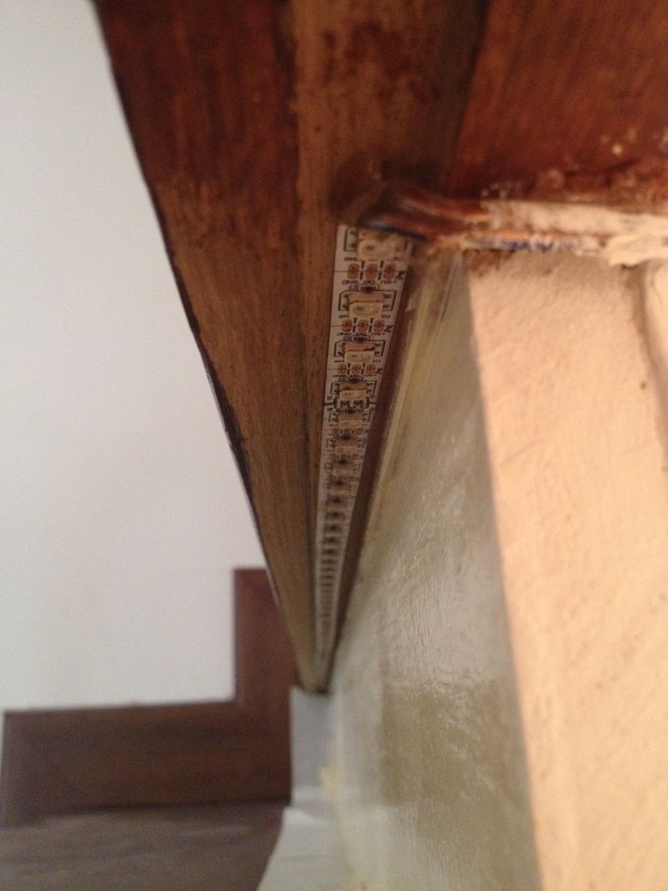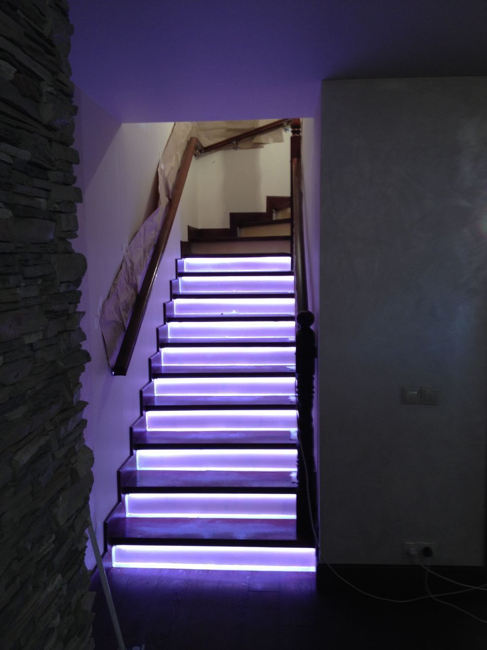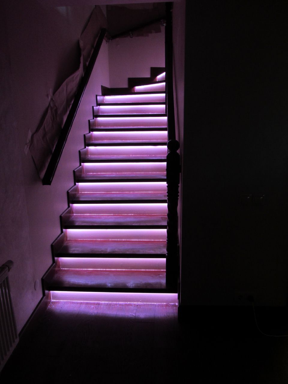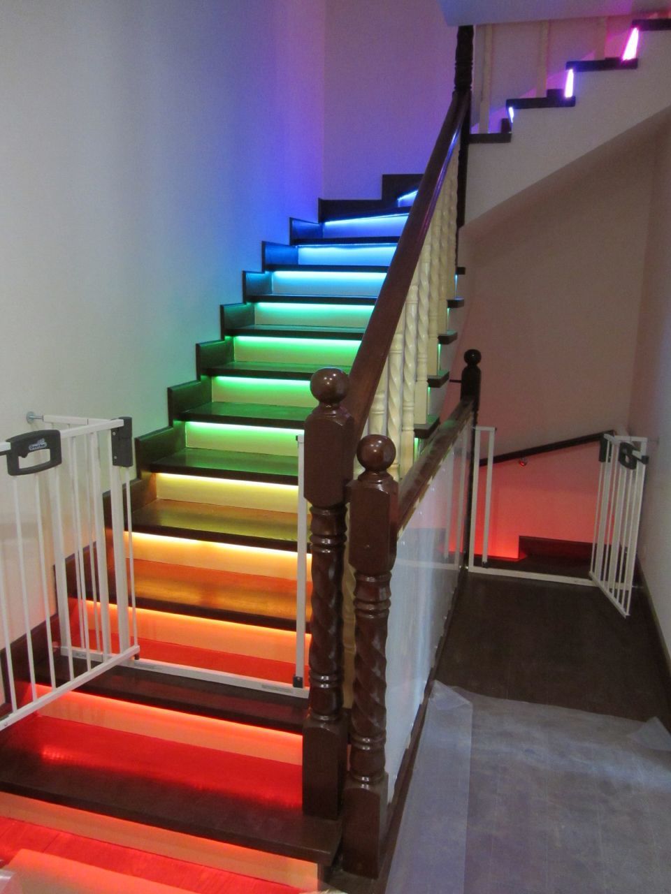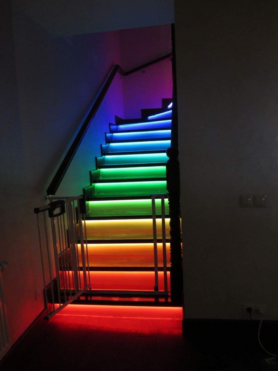 Включение подсветки запускается при подходе к лестнице от инфракрасных датчиков движения внизу и вверху неё. Изюминкой данной лестницы стал световой эффект постепенного освещения ступеней. Ступени загораются снизу вверх при подъеме по лестнице и сверху вниз при спуске с неё. При этом ступени загораются не просто одна за другой, а постепенно, слева направо (относительно направления движения). Светодиодная подсветка работает в двух режимах - белом и многоцветном (цвета радуги).