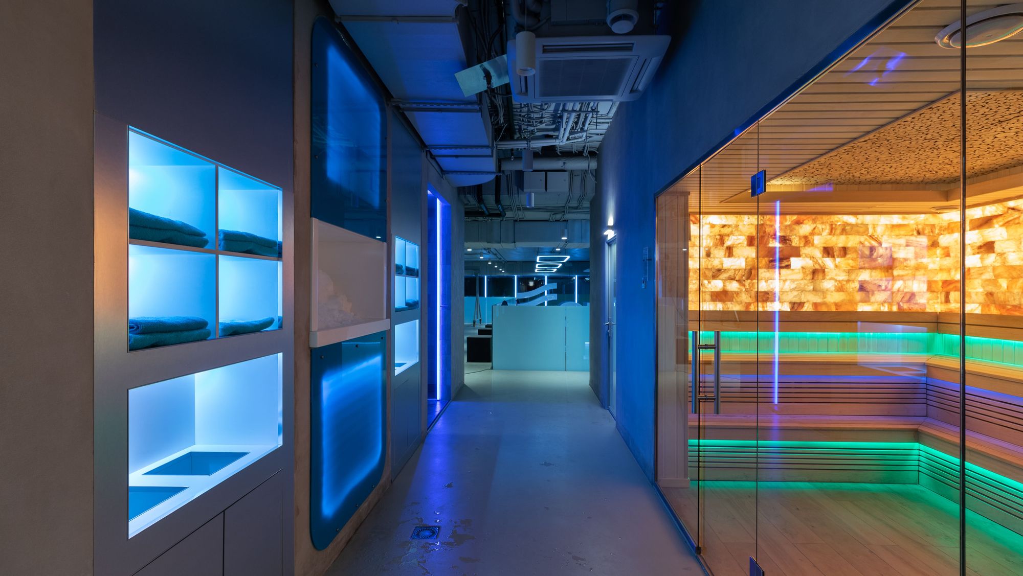 Ручное управление группами светильников, автоматическая смена сцен освещения в течение дня и общее управление всеми источниками света осуществляется с помощью планшета на стойке администратора. В офисном помещении, фитнес-зале и зоне отдыха сделано более спокойное нейтральнее освещение при помощи лент белого свечения.