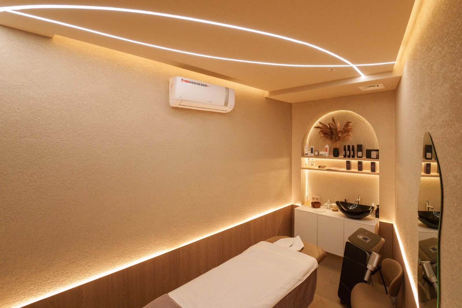Освещение в салоне должно быть достаточно ярким для работы, но при этом мягким, чтобы не утомлять глаза. Добиться такого баланса позволяет сочетание: