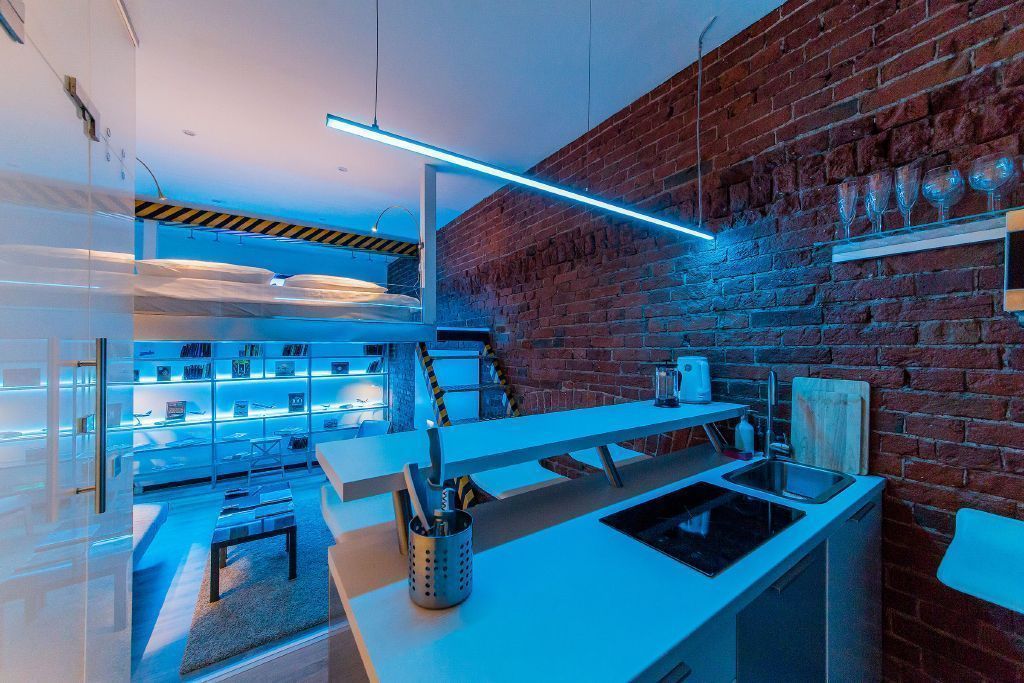 В зоне кухни на тросиках были подвешены линейные светодиодные светильники из алюминиевого профиля и светодиодной ленты RGB. Для подсветки других зон помещения, в частности пола спальной зоны, расположенной на втором уровне студии, была использована синяя светодиодная лента Arlight. Такая подсветка подчеркивает авиационную тематику интерьера, напоминая о голубом небе.