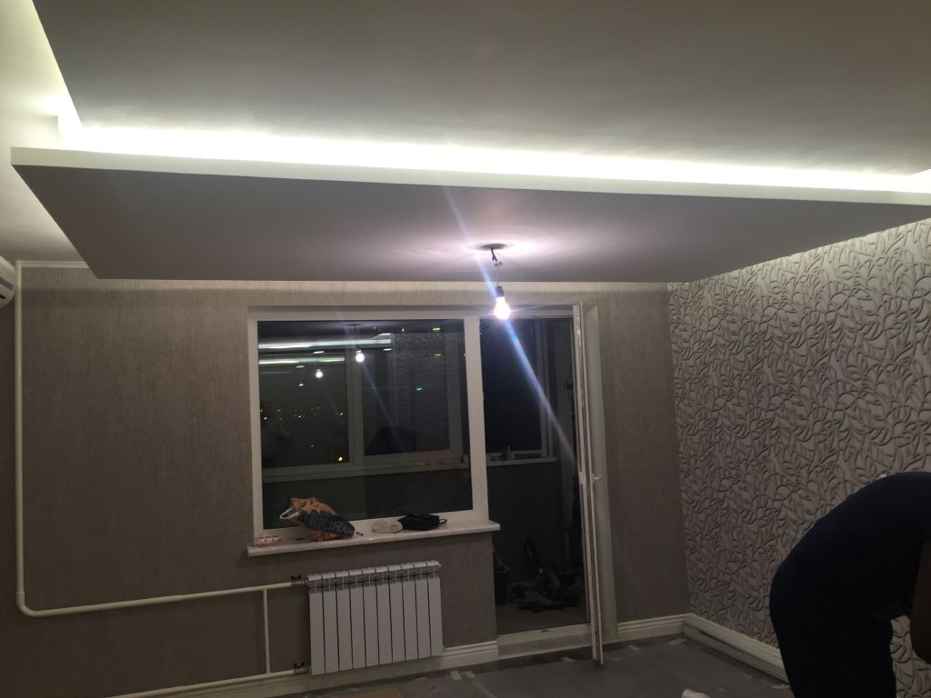 Во всех частях квартиры были сделаны многоуровневые потолки из гипсокартона и все они были дополнены светодиодной подсветкой.