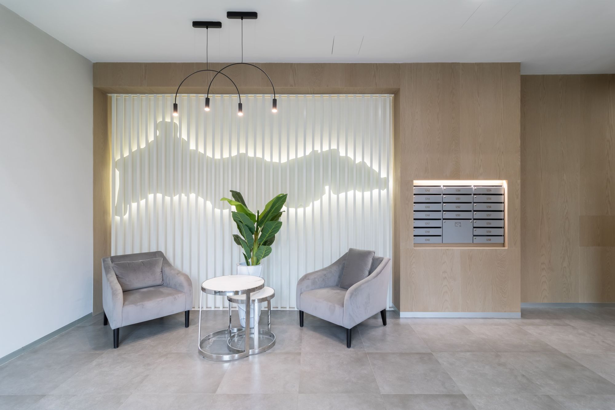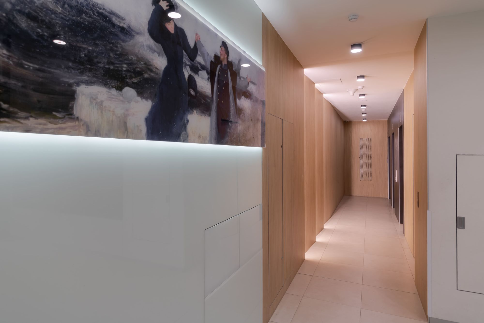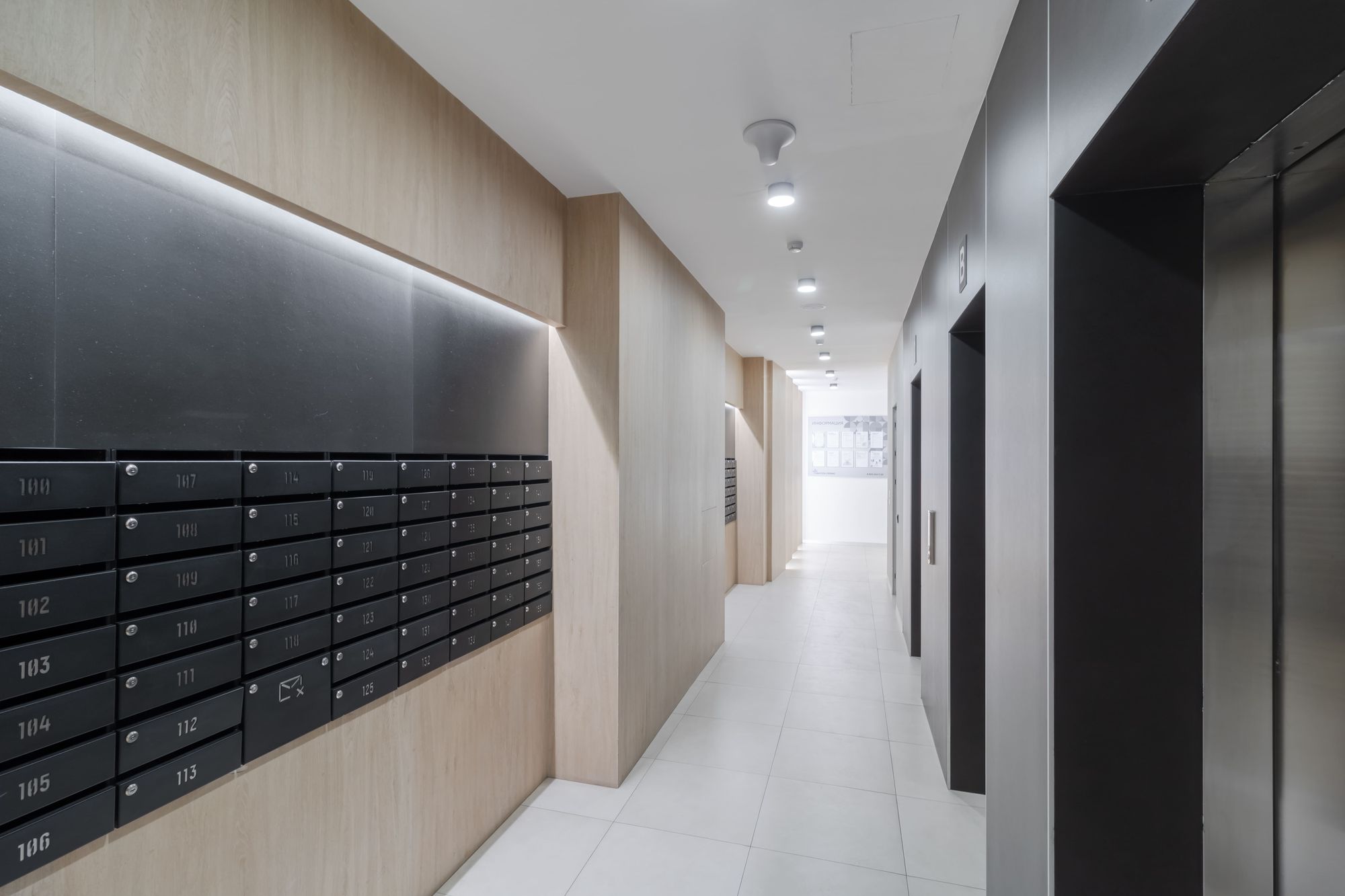 Особый шарм в лобби создается за счет закарнизной подсветки. С помощью накладного профиля SL и светодиодной ленты RT с дневным цветом свечения был сделан акцент на зоне почтовых ящиков и на декоративных элементах, а также была создана вертикальная подсветка деревянных панелей. Благодаря последнему эффекту помещение лобби кажется просторнее, а у жильцов и гостей дома создается ощущение, будто дневной свет проходит сквозь стены.